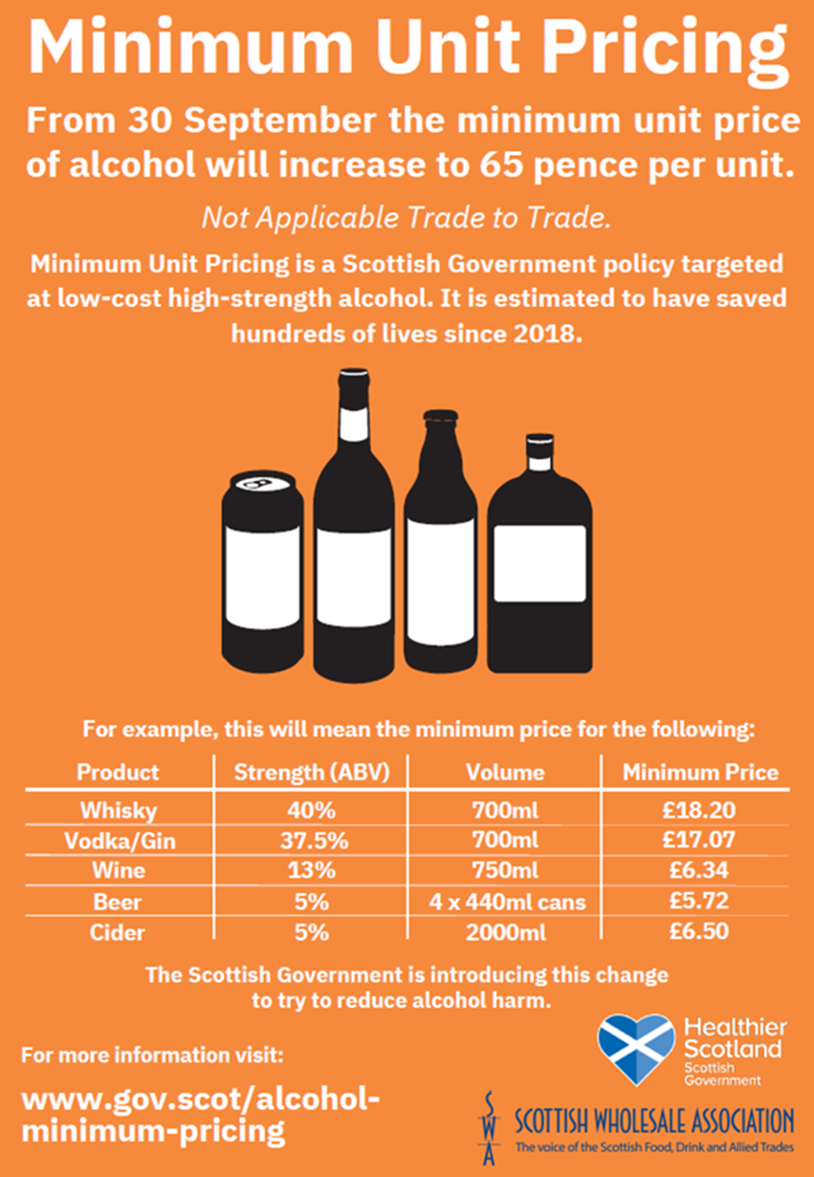Posters and materials have been developed in partnership with Healthier Scotland to help communicate the price change within wholesalers depots. Please find below the SWA MUP posters, highlighting that MUP does not apply trade to trade and where these should only be displayed within wholesalers depots.